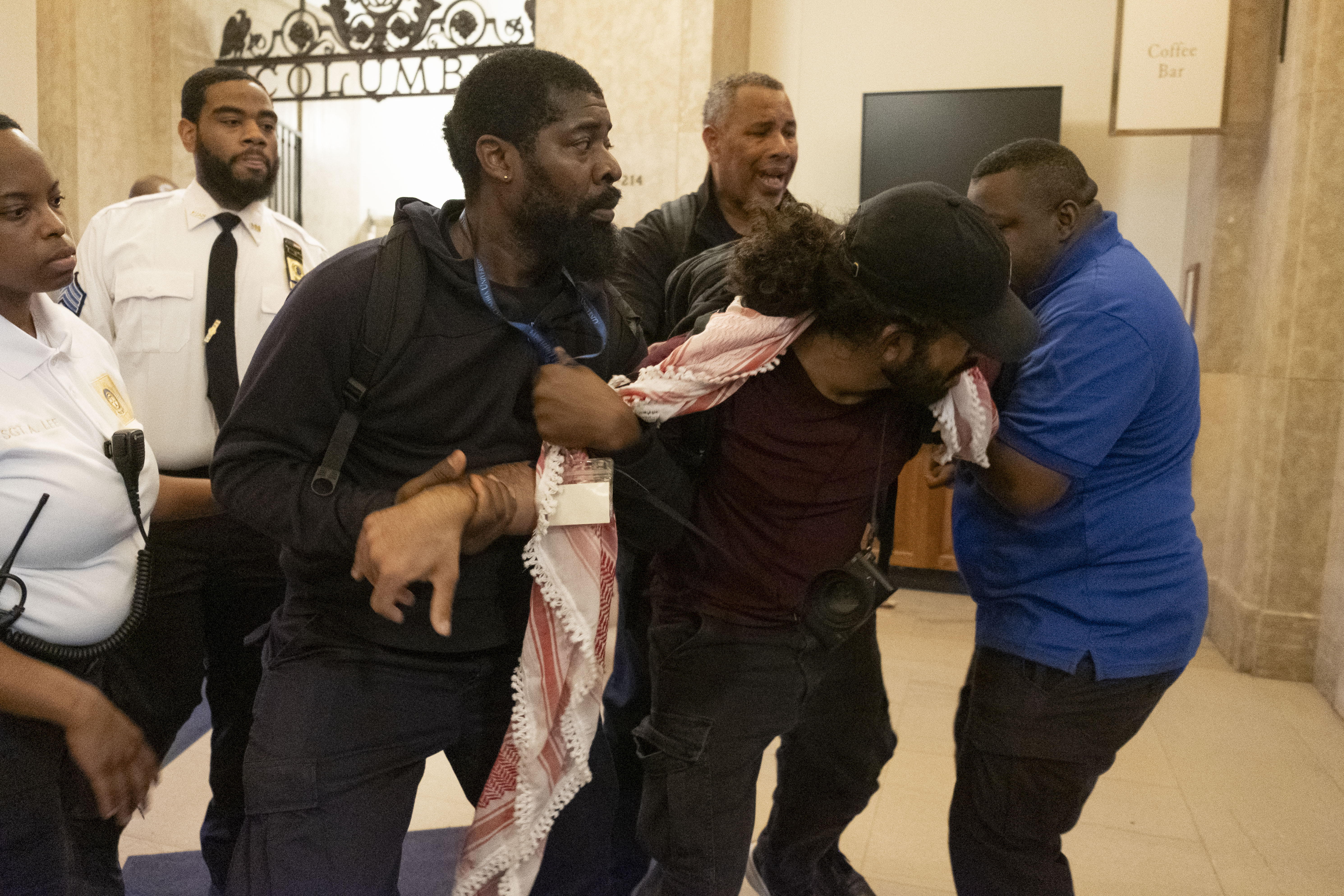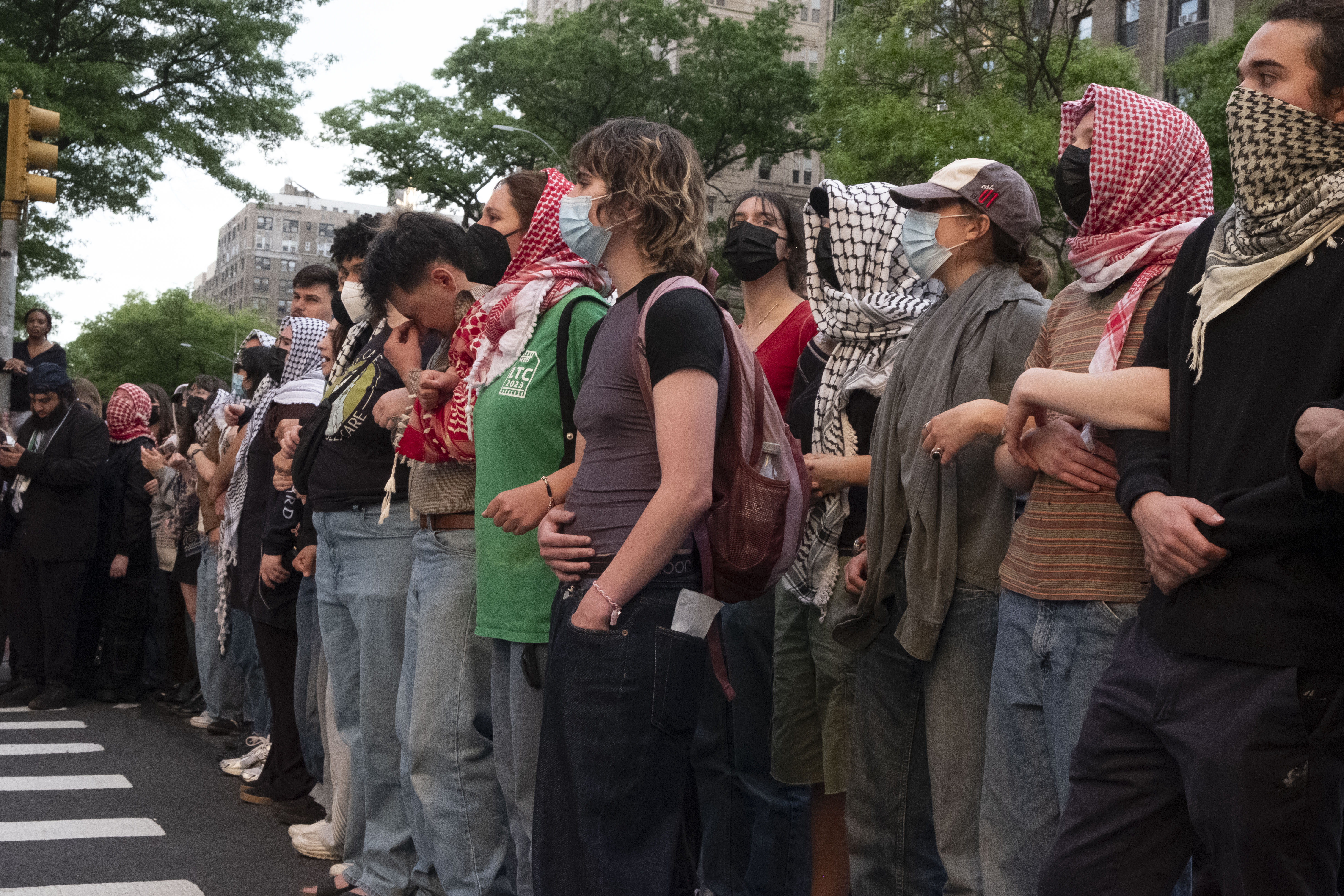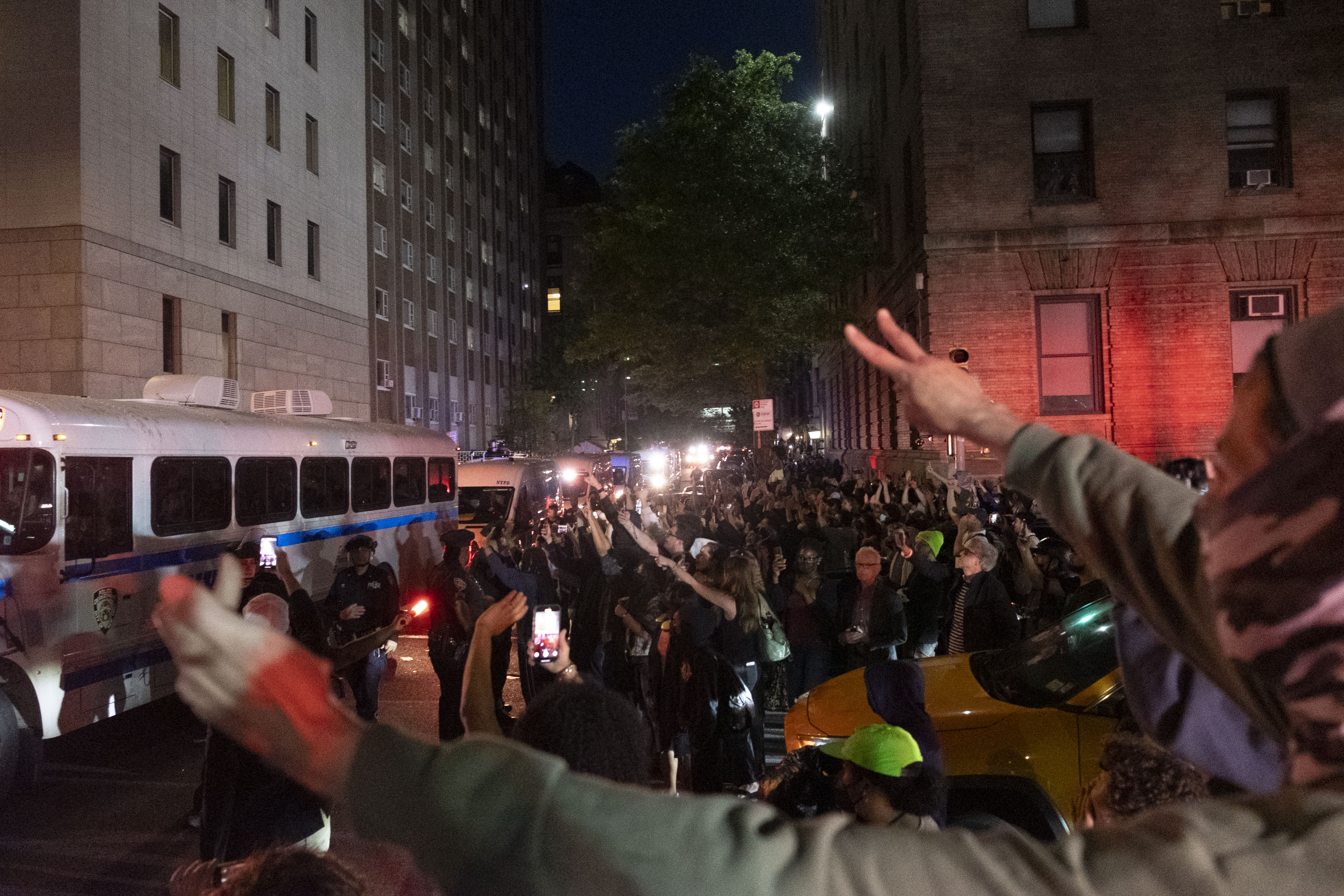 Protests were also staged outside the campus on 114th street and Broadway, a stone’s throw from where students were being led into NYPD buses. During the course of the events, NYPD officers and campus Public Safety personnel used physical force on student protesters inside the campus, as well as on demonstrators gathered outside university grounds.