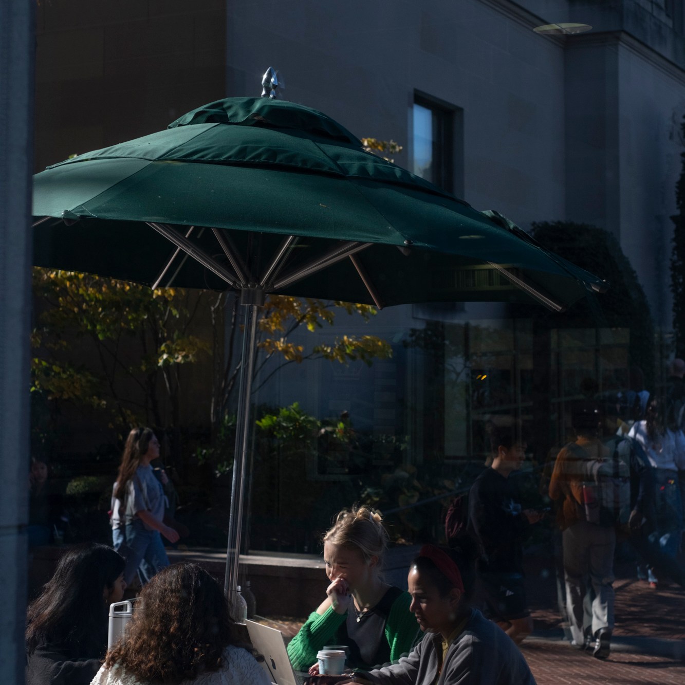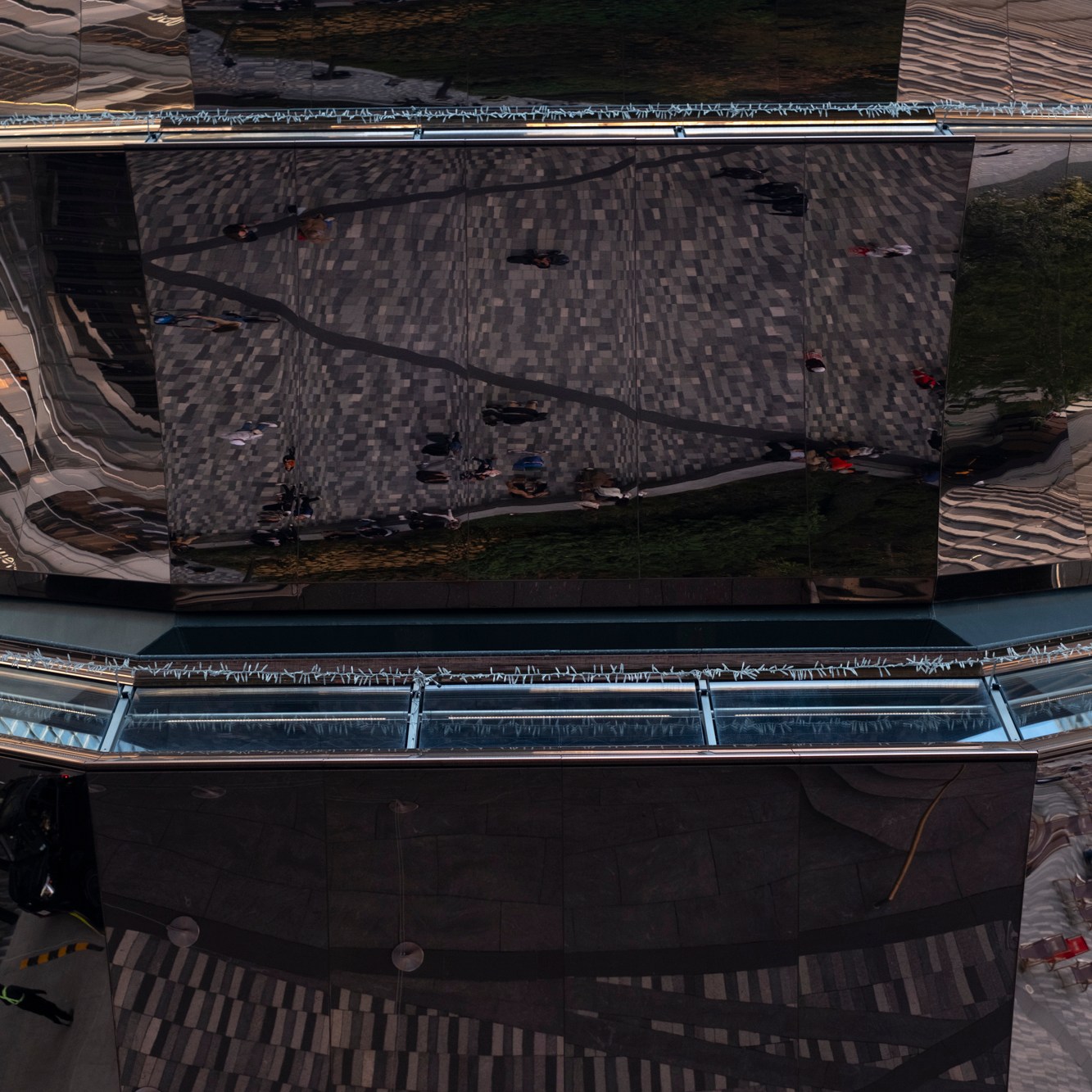 Glass skyscrapers reflect sunlight and mirror the cityscape and its people.